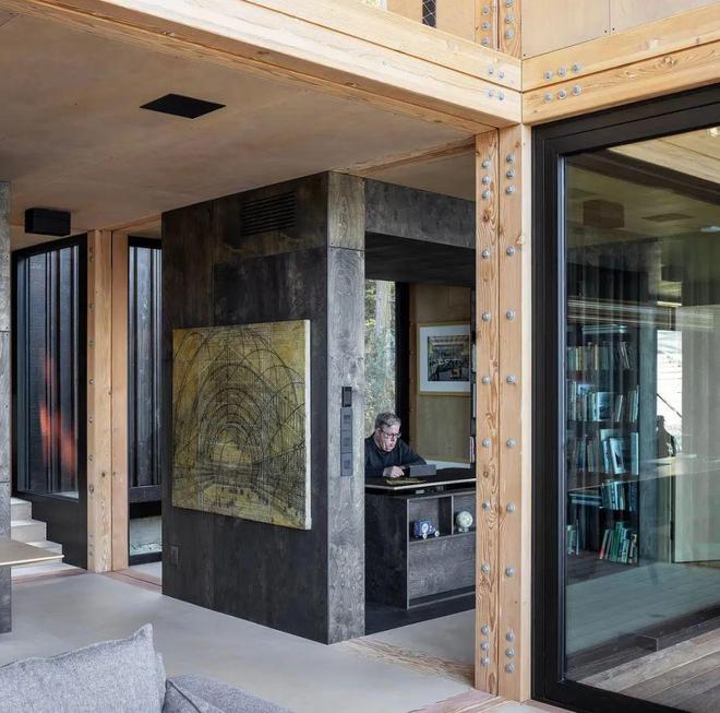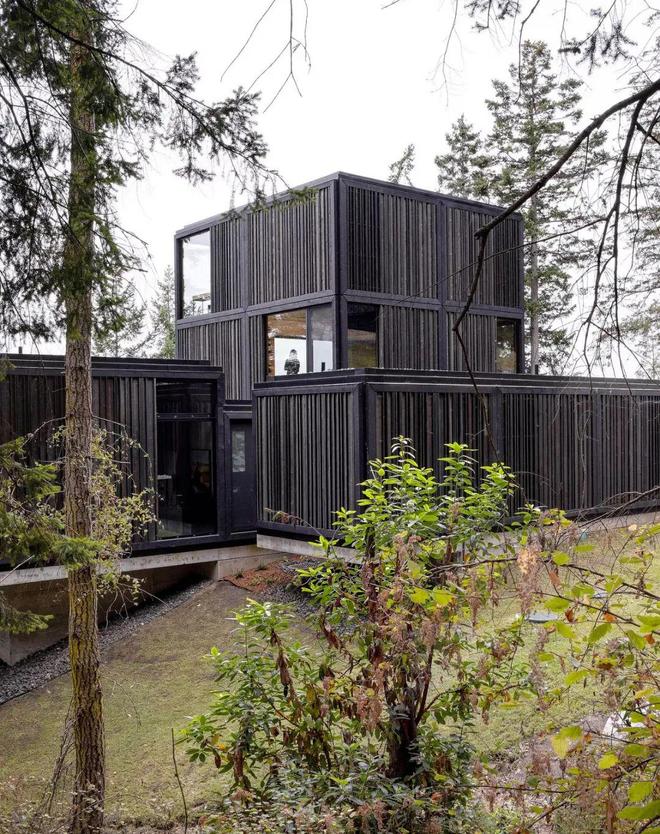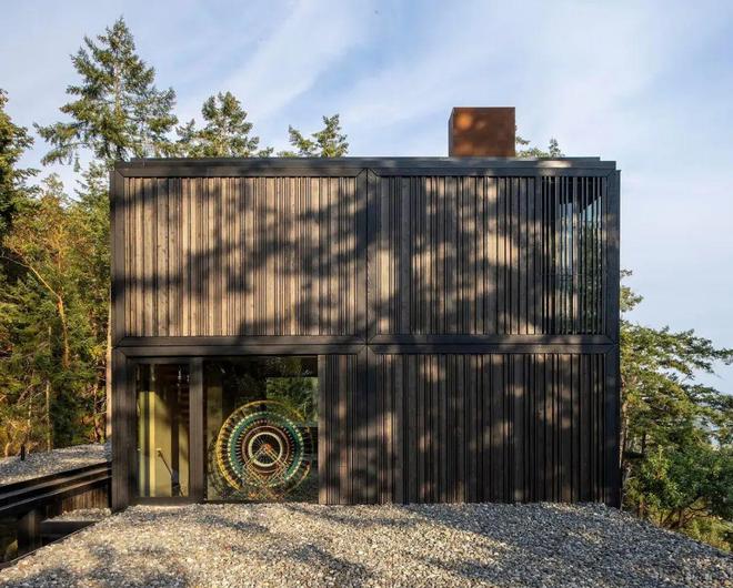 愉景湾住宅的外立面使用了深色清漆处理的雪松木,竖直排列的木板模仿了树干的纹理,进一步加强了建筑与周围森林之间的视觉联系。随着光线变化,木立面的色调与纹理产生了动态的效果,使得建筑在自然环境中既显得雄伟,又不失谦逊。这一设计选择令住宅在太平洋西北荒野中傲然矗立,与大自然完美对话。