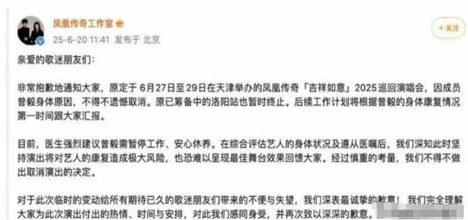 可如今这对活化石级别的组合,正以三伏天里放在室外的雪糕的速度从公众视野里加速融化。自 6 月 15 日之后,玲花的微博就像被按了永久性暂停键,最后一条动态下的评论区早已成了大型 寻人现场;曾毅代言的品牌连夜撤下物料的速度,比超市打折时大妈们抢鸡蛋的身手还要迅猛,仿佛晚一秒就要沾染上什么晦气;原定于天津的演唱会更是像人间蒸发般没了踪影,洛阳演唱会的延期通知则写得如同古代神话里的 天荒地老,连个大致的时间范围都懒得给。