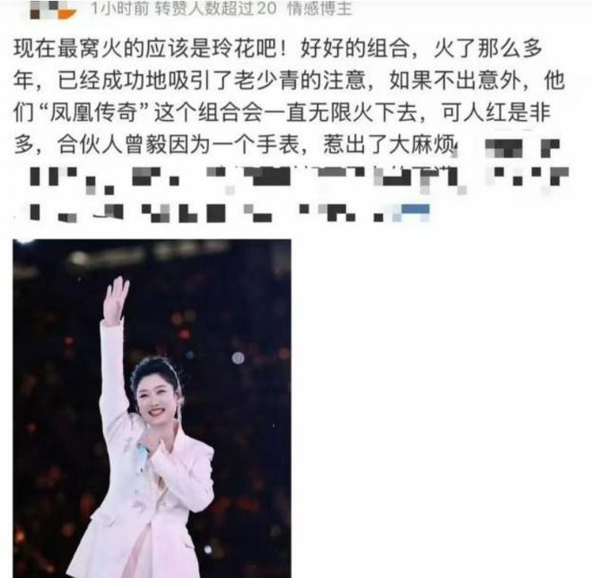但不管背后的真相究竟如何,凤凰传奇这块金字招牌确实在一天天褪色,就像被雨水冲刷多了的年画,色彩越来越暗淡。去年这个时候,玲花还在一档音乐综艺里凭扎实的唱功实力碾压一众流量偶像,在舞台上甚至能一个人轻松唱完曾毅的 part,气定神闲的样子让旁边的年轻偶像们看得目瞪口呆。当时弹幕里全是 建议玲花单飞 曾毅可以下岗了 的调侃,那会儿估计没人把这些话当真,毕竟当时的凤凰传奇是各大晚会的常客,跨年晚会、春节晚会的舞台上总能看到他们的身影,演唱会门票秒罄更是跟玩似的,粉丝们抢票的激烈程度堪比春运抢火车票。玲花和曾毅同框出现是标配,少了任何一个都像炒菜时忘了放盐 —— 总觉得不对劲,浑身不得劲。